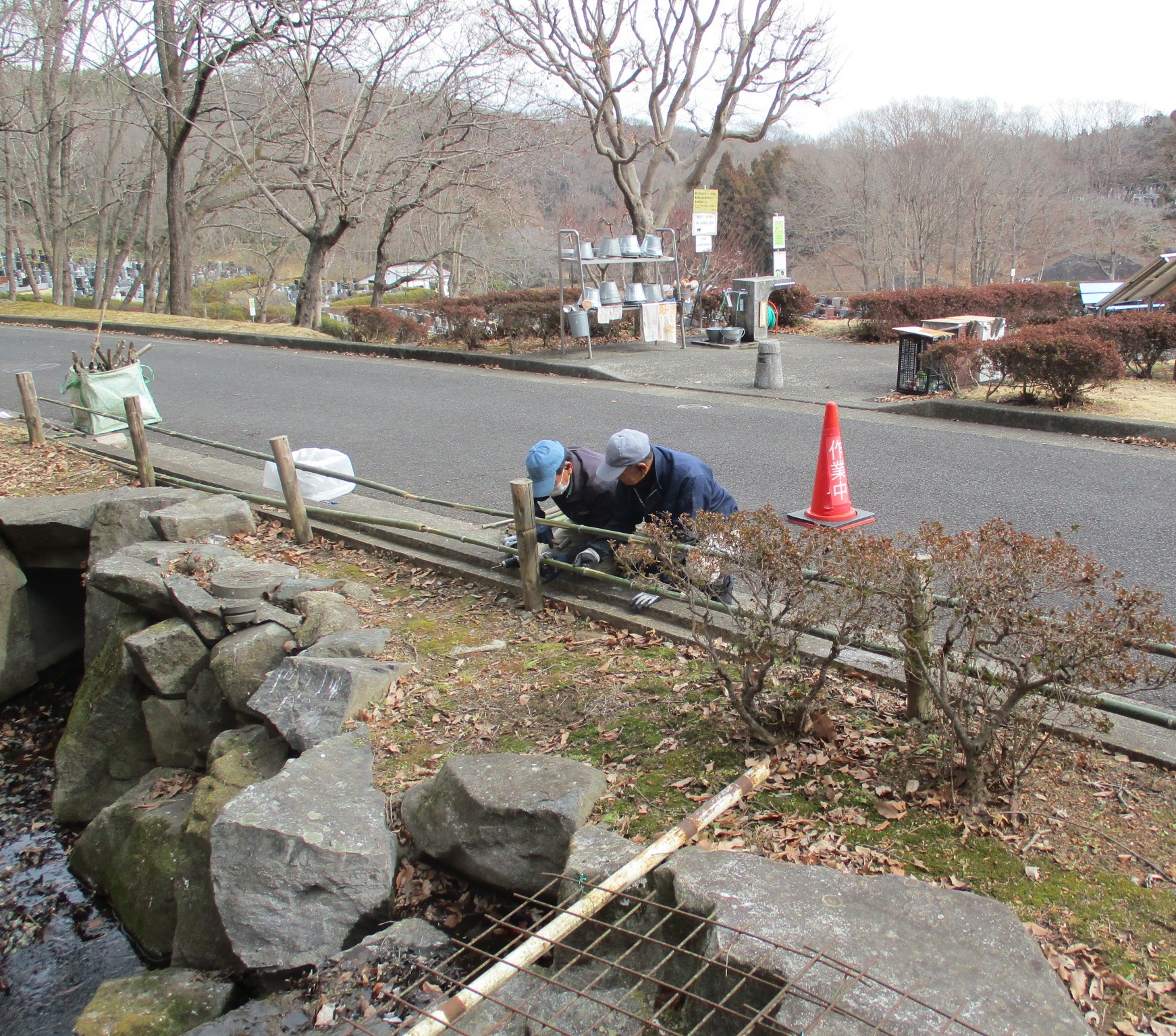 土屋霊園内の竹垣の補修を始めました。